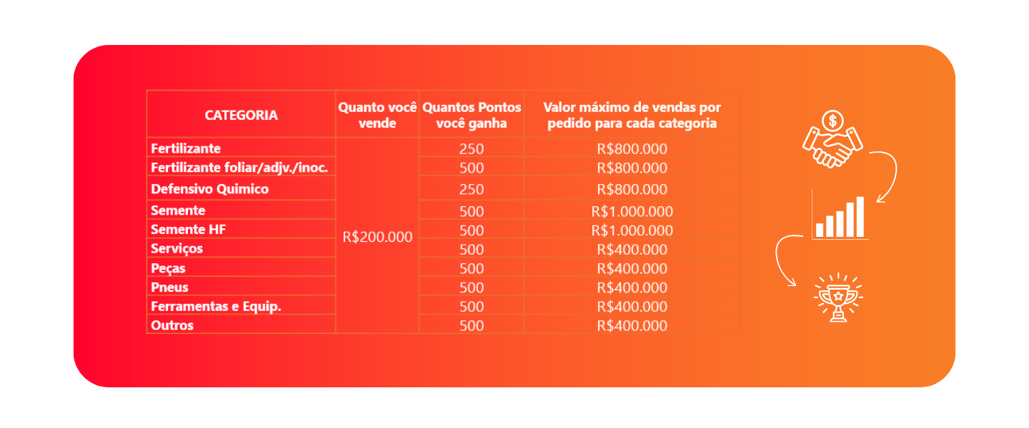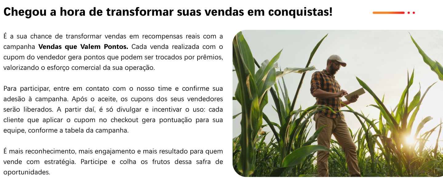 Campanha válida para pedidos realizados exclusivamente por meio do conecta.ag, por distribuidores com loja ativa no período de 01/04/2025 a 30/04/2026, ou enquanto durarem os estoques de pontos destinados à campanha. A bonificação em pontos será concedida após o encerramento da campanha e estará condicionada à confirmação do pagamento integral das faturas emitidas pelas revendas participantes.